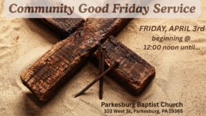 COMMUNITY GOOD FRIDAY SERVICE April 3, 12:00 noon until… There will be a Community Good Friday Service taking place at Parkesburg Baptist Church (103 West St.) starting at 12:00 noon and continuing on until… All are welcome to join this service!